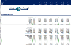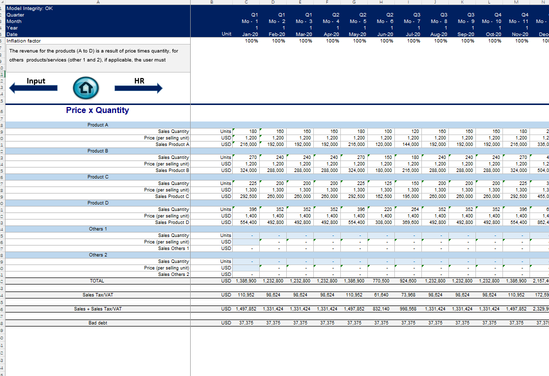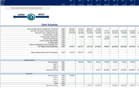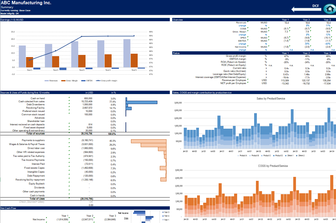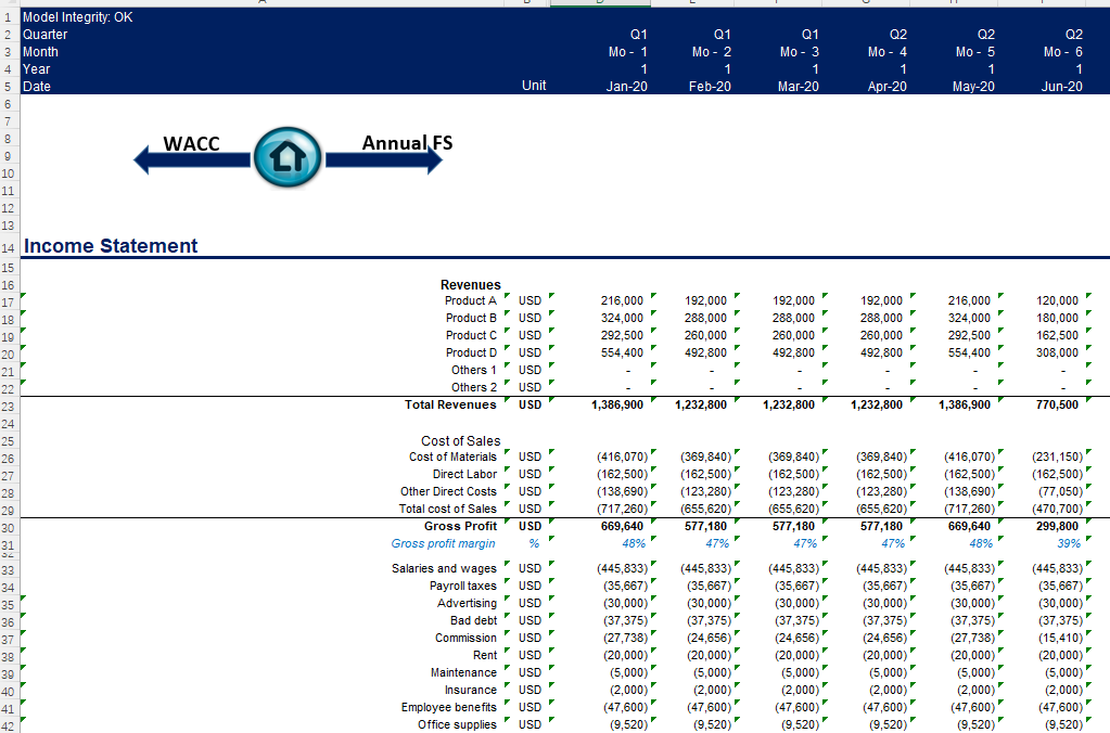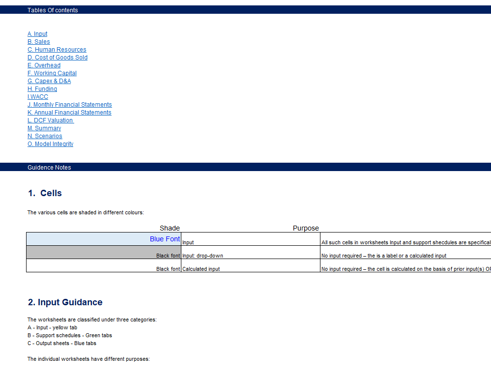 A. Input B. Sales C. Human Resources C. Cost of Goods Sold D. Overhead E. Working Capital F. Capex and D&A G. Funding H. WACC calculation I. Monthly Financial Statements J. Annual Financial Statements K.DCF Valuation L. Summary M. Scenarios Overview N. Model Integrity