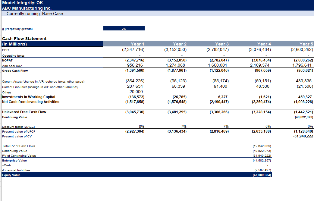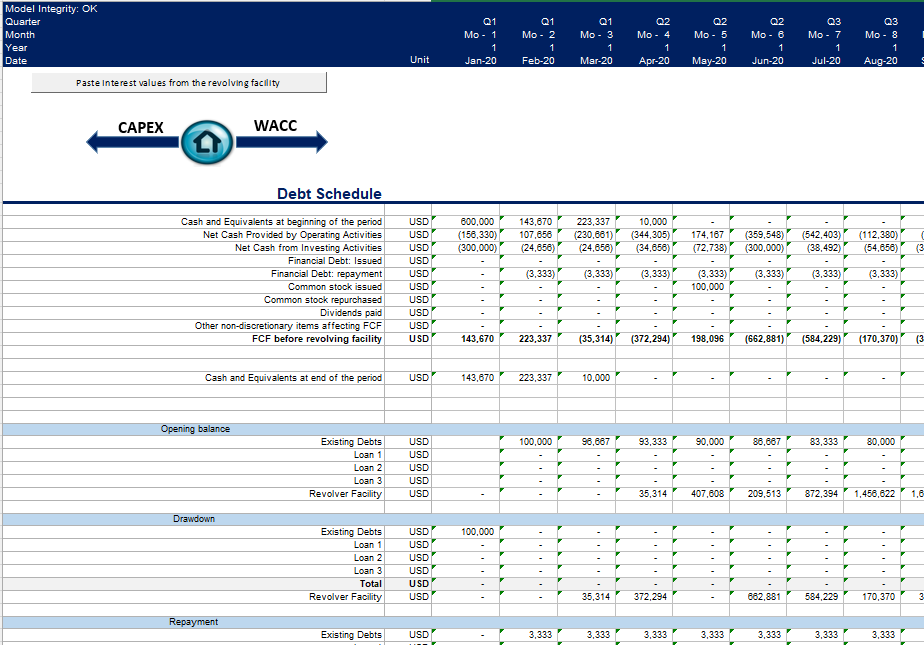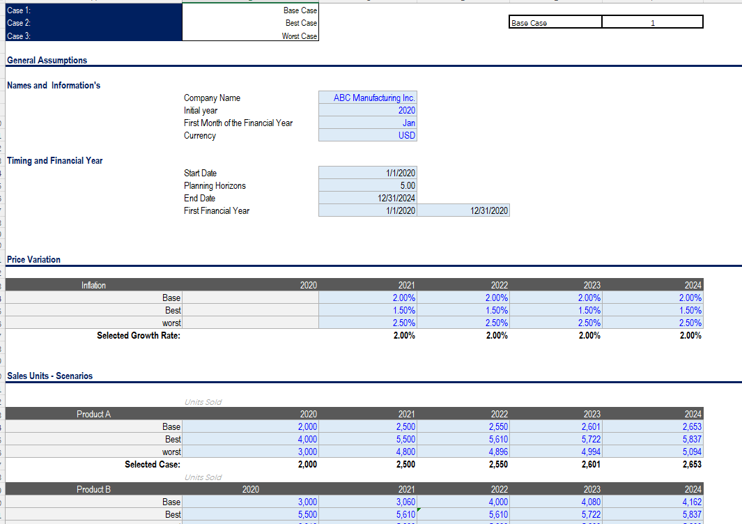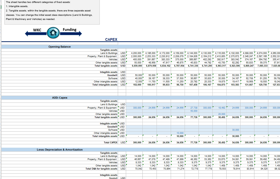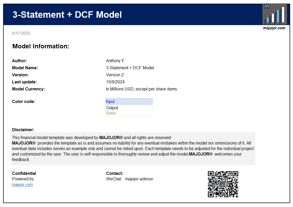 A. Input B. Sales C. Human Resources C. Cost of Goods Sold D. Overhead E. Working Capital F. Capex and D&A G. Funding H. WACC calculation I. Monthly Financial Statements J. Annual Financial Statements K.DCF Valuation L. Summary M. Scenarios Overview N. Model Integrity
