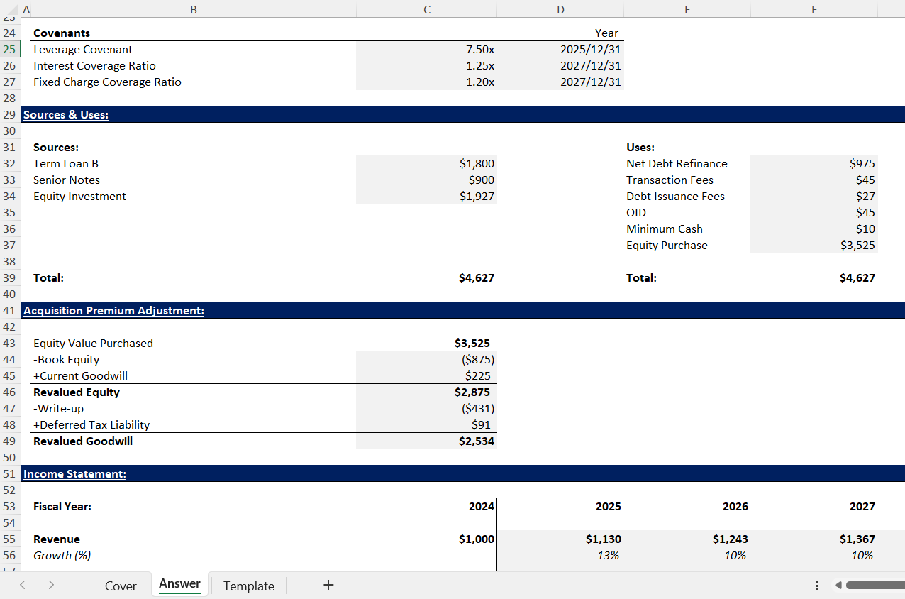 90mins-LBO Testing Model Test (Test + Answer) 8小时前 财务模型 · 高级专属 40 **用户购买后,请在页面下方 /左侧下载栏自行下载 Excel模型,如有疑问,请添加站长微信。模型介绍一、交易背景与收购假设设定收购标的为一家加州软件公司,收购基准日为2024年12月31日。收购方式为100%股权收购,基于LTM EBITDA的10.0倍估值。目标公司当前有10亿美元存量债务需在交易中清偿,资产负债表上现有2500万美元现金,但需保留至少1000万美元的最低现金余额。交易费用为收购企业价值的1%,无形资产将按15%进行摊销,期限5年,税率为21%。这些假设为后续的现金流量和税负计算奠定了基础。二、融资结构测试设计了多层次的资本结构,包括:循环贷款:额度5000万美元,利率为SOFR+250bps,无承诺费,无OID,现金流100%用于偿还。定期贷款B:规模为4.0倍EBITDA,利率为SOFR+650bps,包含1%的PIK利息、1%发行费和2% OID。平时无强制现金流还款,但违约后需100%偿还,且每年有2%的强制性摊销。优先票据:规模为2.0倍EBITDA,票面利率14%,包含3% PIK利息、1%发行费和1% OID,违约后同样触发全额还款。这些债务工具的复杂性体现在OID、PIK利息和发行费的摊销处理上,要求建模者准确计算实际融资金额和利息费用。三、财务契约与违约机制测试设定了三条财务契约:总杠杆率(总债务/EBITDA)不得超过7.5倍,每年测试;利息覆盖率(EBIT/利息费用)和固定费用覆盖率((EBITDA+资本支出+税)/(利息+资本支出))均在收购后第三年开始测试;若触发违约,将启动“全额快速摊销”,即所有剩余债务立即偿还,这将显著影响现金流分配和股权回报。四、退出假设假设五年后退出,退出倍数同样为10.0倍LTM EBITDA,且所有债务必须在退出时清偿,期间不得向股东分红。这意味着股权回报完全依赖于退出时的企业价值减去债务后的净收益。五、运营与财务预测基础运营假设提供了详细的收入增长率、成本结构、营运资本周转天数、D&A与资本支出匹配等数据。这些数据将用于构建利润表、资产负债表和现金流量表,从而预测未来五年的自由现金流、债务偿还能力及最终的可分配价值。模型展示 常见问题 (FQ&A) 问:购买之后可以申请退款吗? 答:因为课程属于虚拟物品,所以购买之后不能退换,请仔细阅读课程介绍后,再谨慎购买。问:我已购买会员VIP,是否有会员权益? 答:是,年费VIP会员可享9折购买培训课程;终身VIP会员可用剩余课程答疑时间兑换抵扣培训课时,超出的课时可享9折购买。终身VIP会员购买前请联系站长微信(majojor-advisor)确认兑换的课时。问:我目前是年费VIP,是否可以补差价升级终身VIP,并享受抵扣培训课时的权益? 答:是,年费VIP会员可补差价升级成为终身VIP并兑换抵扣培训课时。 版权声明1、本站所有付费内容都由 Majojor Finance 拥有独家版权和最终解释权。 2、以下均为侵权行为:使用录屏软件以及其他手段录制课程视频;通过技术手段非法下载课程内容;上传课程内容到网盘或者其他平台;通过网络传播课程内容;向其他人分享 Majojor Finance 付费账户并以此非法牟利。Majojor Finance 将永久冻结非法分享的账户,并对以上所有侵权行为进行法律和经济上的追究和诉讼,绝不妥协。 3、只有版权得到保护,才会有更多优秀的作品出现。希望大家尊重我们的劳动成果,尊重版权,一起让我们的版权环境越来越好。 4、若无法遵守以上 Majojor Finance 的版权保护要求,请勿购买我们的课程,凡购买即视为同意以上要求。 资源下载高级会员 免费下载 折后0元下载价格400 元高级会员免费立即购买普通购买下载价格400 元立即购买下载咨询请添加顾问微信:majojor-advisor 原文链接:https://majojor.com/financialmodel/90mins-lbo-testing-model-test/,转载请注明出处~~~ 0 0