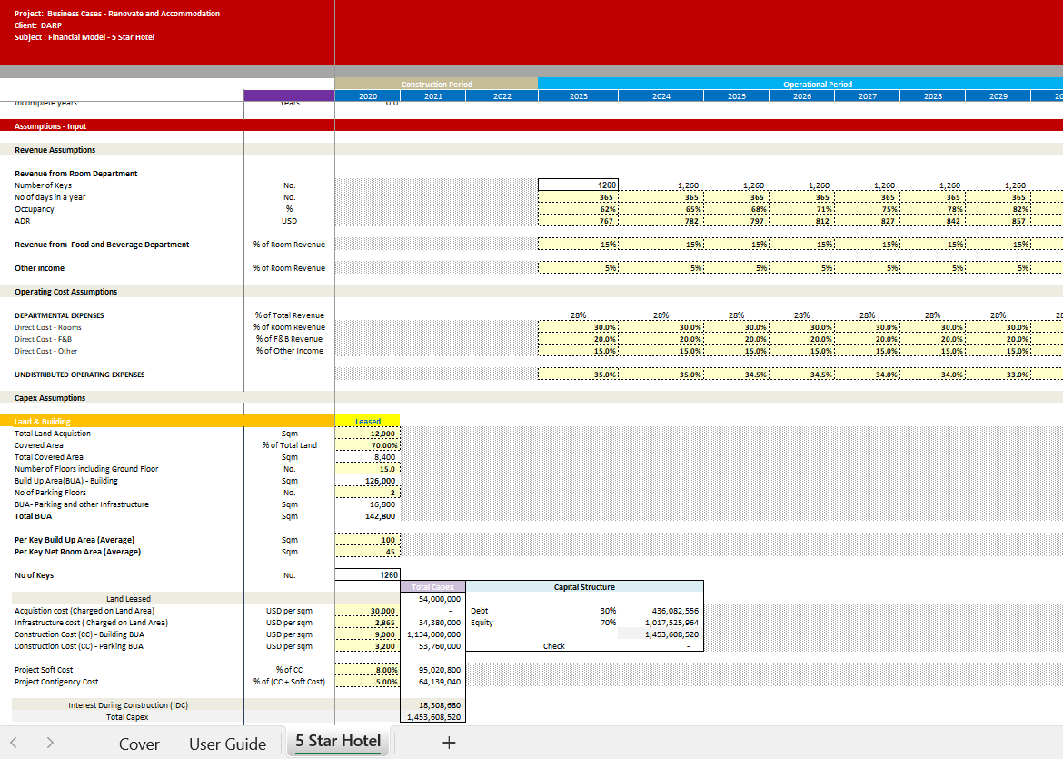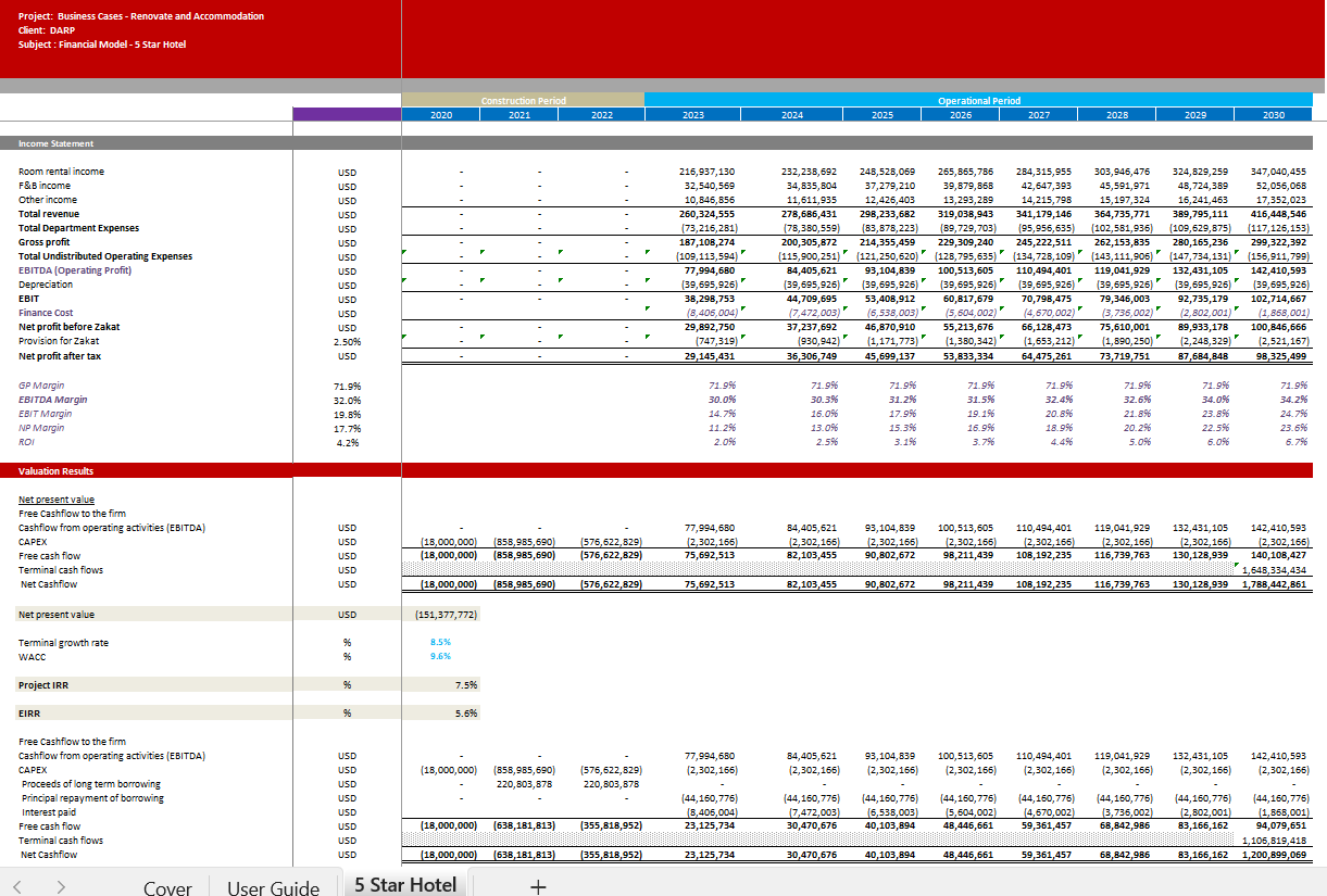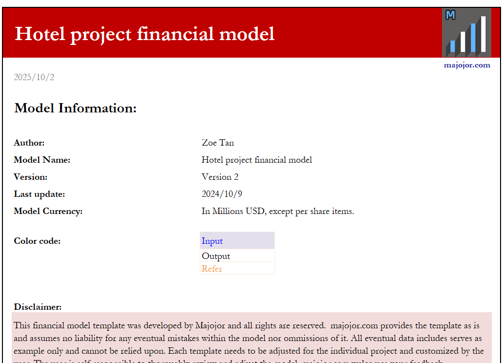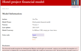 O230037 酒店项目财务模型 2025-02-02 财务模型 · 中级会员 486 **用户购买后,请在页面下方 /左侧下载栏自行下载 Excel模型,如有疑问,请添加站长微信。模型介绍这是一份10年酒店投资项目财务模型:酒店收入模型, 分成3种收入去预测:1) 客房收入 (Room revenue) = ADR * Occupancy * Days in a year * Number of room ( 日均房价 * 入住率 * 营业天数/年 * 房间数)2) 餐饮收入 (Food & beverages) = 客服收入的百分比 (as a % of Room revenue)3) 其他收入 (Others) = 客服收入的百分比 (as a % of Room revenue)模型展示 常见问题 (FQ&A) 问:购买之后可以申请退款吗? 答:因为课程属于虚拟物品,所以购买之后不能退换,请仔细阅读课程介绍后,再谨慎购买。问:我已购买会员VIP,是否有会员权益? 答:是,年费VIP会员可享9折购买培训课程;终身VIP会员可用剩余课程答疑时间兑换抵扣培训课时,超出的课时可享9折购买。终身VIP会员购买前请联系站长微信(majojor-advisor)确认兑换的课时。问:我目前是年费VIP,是否可以补差价升级终身VIP,并享受抵扣培训课时的权益? 答:是,年费VIP会员可补差价升级成为终身VIP并兑换抵扣培训课时。 版权声明1、本站所有付费内容都由 Majojor Finance 拥有独家版权和最终解释权。 2、以下均为侵权行为:使用录屏软件以及其他手段录制课程视频;通过技术手段非法下载课程内容;上传课程内容到网盘或者其他平台;通过网络传播课程内容;向其他人分享 Majojor Finance 付费账户并以此非法牟利。Majojor Finance 将永久冻结非法分享的账户,并对以上所有侵权行为进行法律和经济上的追究和诉讼,绝不妥协。 3、只有版权得到保护,才会有更多优秀的作品出现。希望大家尊重我们的劳动成果,尊重版权,一起让我们的版权环境越来越好。 4、若无法遵守以上 Majojor Finance 的版权保护要求,请勿购买我们的课程,凡购买即视为同意以上要求。 资源下载中级会员 免费下载 折后0元下载价格300 元中级会员免费立即购买普通购买下载价格300 元立即购买下载咨询请添加顾问微信:majojor-advisor 原文链接:https://majojor.com/financialmodel/o230037-hotel-project-financial-model/,转载请注明出处~~~ 0 0