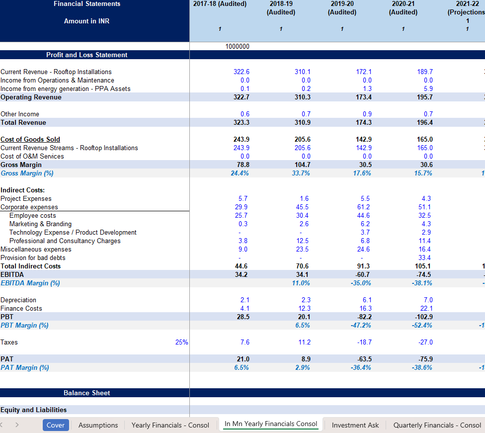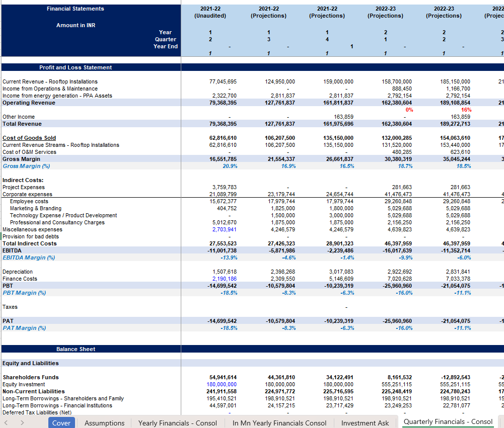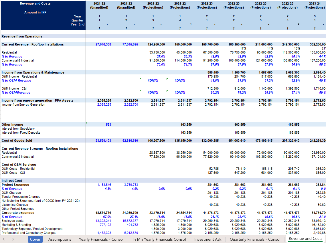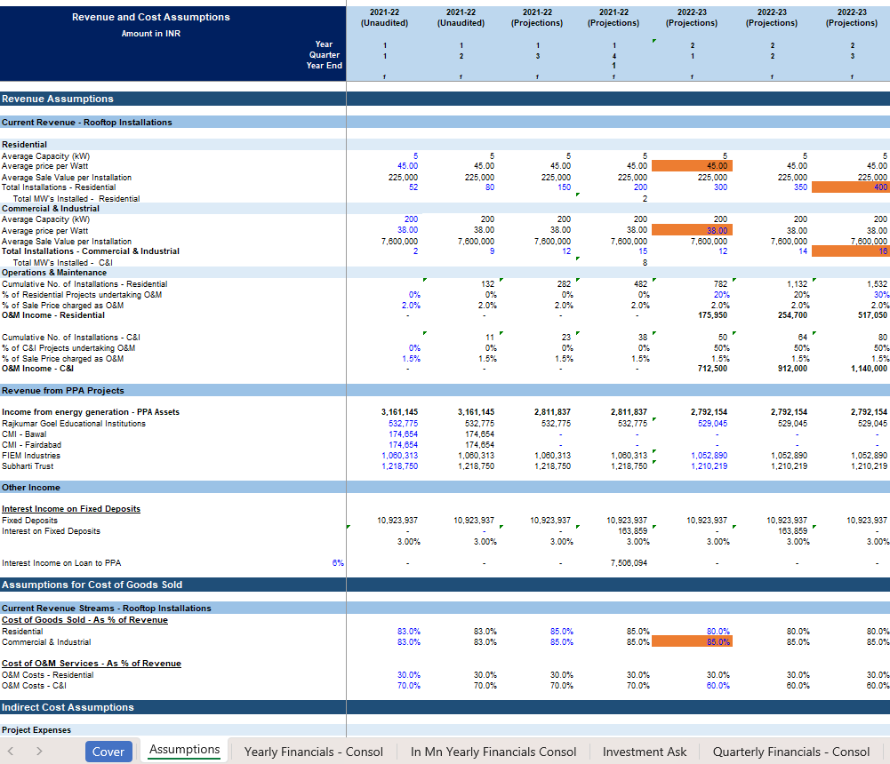 Renewable Energy Financial Model 12小时前 财务模型 · 高级专属 42 **用户购买后,请在页面下方 /左侧下载栏自行下载 Excel模型,如有疑问,请添加站长微信。模型介绍“可再生能源财务模型”是一款基于 Excel 的专业级工具,专为可再生能源开发商、投资者、顾问以及项目融资者设计,旨在帮助他们评估和预测清洁能源项目的财务表现。无论您是在开发太阳能农场、风力项目、水电站还是生物质能设施,此模型都能帮助您准确预测收入、支出、现金流以及投资回报。它旨在将工程可行性与财务决策之间存在的差距缩小,让您清晰了解盈利情况、风险以及资本需求。该模型涵盖了能源生产预测(千瓦时/兆瓦时)、电价或电力购买协议(PPA)、政府激励措施、资本支出(CAPEX)、运营成本(OPEX)以及融资结构等方面的内容。此外,它还包含了可供银行使用的投资指标,如内部收益率(IRR)、净现值(NPV)、投资回报率(ROI)和债务偿还覆盖率(DSCR),因此非常适合用于向投资者、贷款方和利益相关者进行展示。项目背景本财务模型专为一家从事太阳能光伏系统集成与运营的能源公司设计,该公司核心业务包括面向住宅、商业及工业客户的屋顶光伏系统销售与安装,以及基于购电协议(PPA) 的能源资产运营。公司市场位于印度,业务正处于从项目销售向“销售+长期服务”模式转型的阶段,并寻求通过股权及债权融资支持其规模扩张。搭建思路该模型的构建遵循了“假设驱动、三表联动” 的专业财务模型构建逻辑,具体思路如下:1. 结构化假设输入(驱动引擎)模型将所有关键业务和财务驱动因素集中于 Assumptions 工作表,作为唯一输入源。收入侧:细化至住宅与工商业客户的安装数量、平均系统容量(kW)、单位售价(Rs/W),并构建了售价逐年温和下降的假设,以反映技术进步与市场竞争。同时,模型前瞻性地纳入了运维服务收入,基于累计安装基数和签约比例计算,将一次性销售收入转化为持续性收入流。成本侧:同样按业务分部设定销售成本率,并独立设定运维服务成本率。间接费用(员工、市场、研发等)部分采用固定金额,部分采用占收入比的方式预测,兼具刚性和弹性。资产负债表与融资:详细模拟了营运资本周期(应收账款天数、应付账款天数、存货水平)、资本性支出计划(资产购置与资本化)及复杂的融资结构(包括股东贷款、金融机构长期贷款、短期营运资本贷款等),并设定了明确的还款计划。2. 动态财务预测(三层联动计算)利润表:在 Quarterly Financials - Consol(未直接显示但被引用)和 Yearly Financials - Consol 中,收入与各项成本费用均直接链接自 Assumptions 表中的计算结果。模型自动计算毛利润、EBITDA、税前利润(PBT)及税后利润(PAT),并清晰展示利润率变化趋势。资产负债表:以假设表中的资产与负债项目计算为基础,每个期末余额均通过“期初余额 + 本期变动”的逻辑得出。模型特别注重了现金余额作为校验平衡项,确保资产负债表配平,这是财务模型可靠性的关键标志。现金流量表:以净利润为起点,通过调整非现金项目、营运资本变动、投资活动和融资活动,推导出现金净变动,最终与资产负债表中的现金余额勾稽,形成闭环验证。3. 多维度结果呈现与灵活调整时间维度:提供季度(在假设和未显示的季度表中)和年度(Yearly Financials - Consol)两种颗粒度的视图,兼顾短期运营监控和长期战略规划。货币维度:提供本地货币(INR) 的详细模型和标准化百万美元(In Mn Yearly Financials Consol) 的汇总版本,方便国际投资者审阅。情景分析潜力:所有核心输出(收入、利润、现金流)均直接依赖于 Assumptions 表中的输入变量。用户可以通过调整安装增长率、价格、成本率、融资条款等关键假设,快速观测不同业务情景下的财务结果,评估项目风险和回报。总结而言,该模型以详实、结构化的业务假设为核心,通过严谨的会计逻辑将业务计划转化为三张互联的财务报表,形成了一个能够评估太阳能项目公司财务可行性、资金需求及投资价值的强大分析工具。模型展示 常见问题 (FQ&A) 问:购买之后可以申请退款吗? 答:因为课程属于虚拟物品,所以购买之后不能退换,请仔细阅读课程介绍后,再谨慎购买。问:我已购买会员VIP,是否有会员权益? 答:是,年费VIP会员可享9折购买培训课程;终身VIP会员可用剩余课程答疑时间兑换抵扣培训课时,超出的课时可享9折购买。终身VIP会员购买前请联系站长微信(majojor-advisor)确认兑换的课时。问:我目前是年费VIP,是否可以补差价升级终身VIP,并享受抵扣培训课时的权益? 答:是,年费VIP会员可补差价升级成为终身VIP并兑换抵扣培训课时。 版权声明1、本站所有付费内容都由 Majojor Finance 拥有独家版权和最终解释权。 2、以下均为侵权行为:使用录屏软件以及其他手段录制课程视频;通过技术手段非法下载课程内容;上传课程内容到网盘或者其他平台;通过网络传播课程内容;向其他人分享 Majojor Finance 付费账户并以此非法牟利。Majojor Finance 将永久冻结非法分享的账户,并对以上所有侵权行为进行法律和经济上的追究和诉讼,绝不妥协。 3、只有版权得到保护,才会有更多优秀的作品出现。希望大家尊重我们的劳动成果,尊重版权,一起让我们的版权环境越来越好。 4、若无法遵守以上 Majojor Finance 的版权保护要求,请勿购买我们的课程,凡购买即视为同意以上要求。 资源下载高级会员 免费下载 折后0