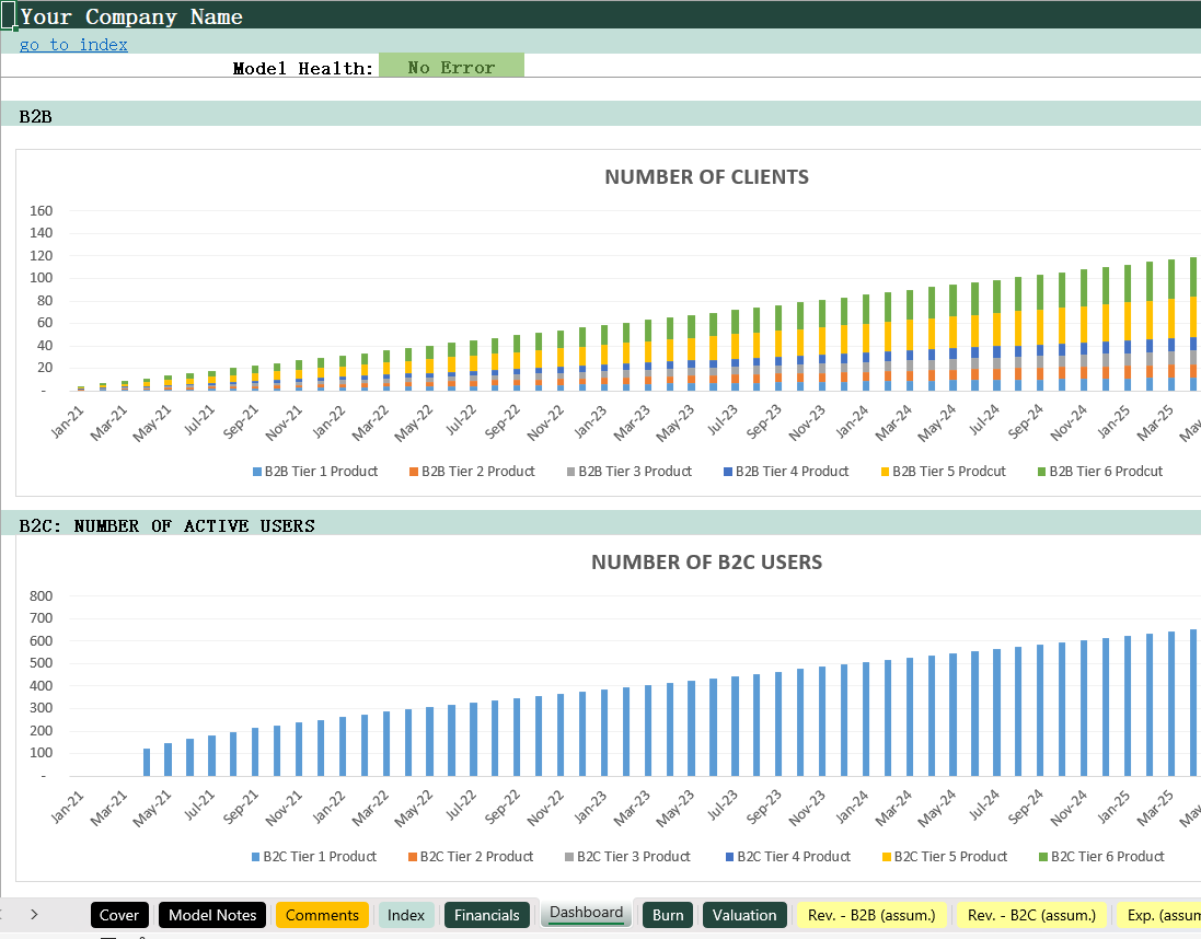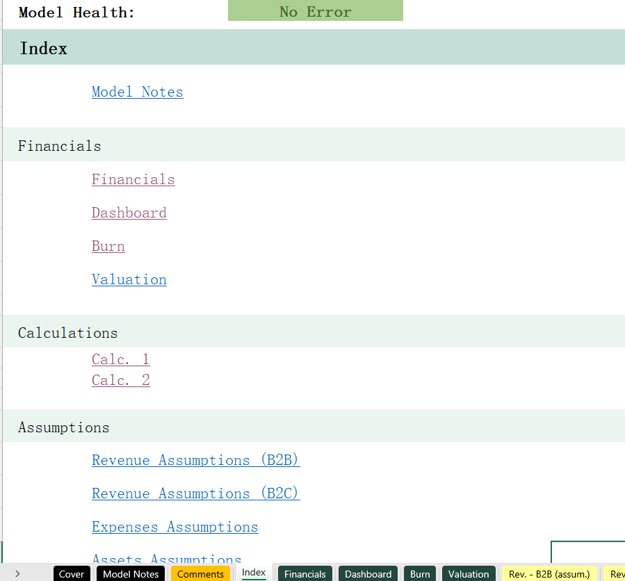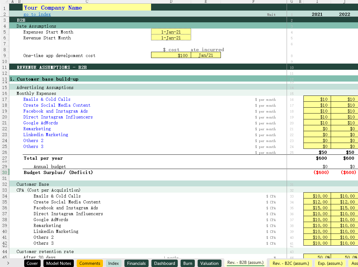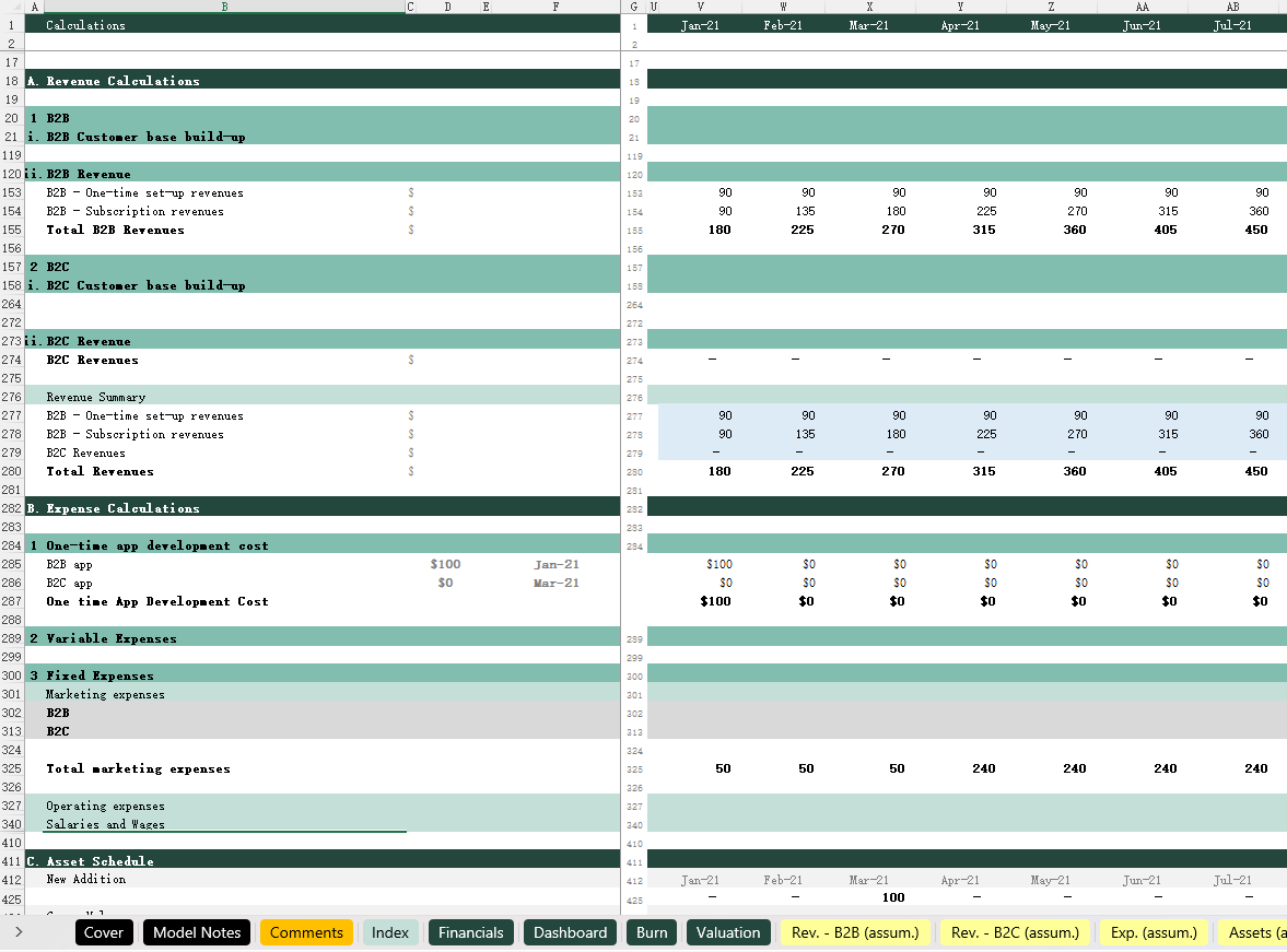 SAAS (B2B+B2C)_Financial model 16小时前 财务模型 · 高级专属 38 **用户购买后,请在页面下方 /左侧下载栏自行下载 Excel模型,以及获取课件观看方式(下载地址2),如有疑问,请添加站长微信。模型介绍此模型适用于任何 SaaS 创业公司,无论是 B2B 业务还是 B2C 业务。模型的关键内容:1)Index – 模型目录,呈现模型的结构(输入,计算以及输出)可以快速定位每一张工作表。2)Financials – 输出三张配平的财务报表,包括月度报表与年度报表。3) Dashboard/Burn – 输出数据可视化图标,包括财务数据汇总,用户数量,现金趋势以及现金消耗率等。4)Valuation – 对项目现金流进行折现估值。5)Rev.(B2B) 与 Rev. (B2C) – 的关键假设条件,包括广告假设,用户数量,分层级的客户分布,获客成本(CPA),客户留存率、每位客户的订阅费用等。6)Exp. (assum.) – 各种费用预测,分成固定费用与变动费用。7) Assets (assum.) – 固定资产预测,包括金额,折旧年限等。8)Debt (assum.) – 债务还款预测,包括本金,利息,借款起始日期等。9)Cap. Table – 股权计算表,记录各种股权资本的变动情况。10)Calc. 1 – 计算表1,展示各种模型的预测计算,包括收入预测,资本预测,固定资产折旧预测,债务预测等。11)Calc. 2 – 计算表2,用于展示资金分布情况。 模型展示 常见问题 (FQ&A) 问:购买之后可以申请退款吗? 答:因为课程属于虚拟物品,所以购买之后不能退换,请仔细阅读课程介绍后,再谨慎购买。问:我已购买会员VIP,是否有会员权益? 答:是,年费VIP会员可享9折购买培训课程;终身VIP会员可用剩余课程答疑时间兑换抵扣培训课时,超出的课时可享9折购买。终身VIP会员购买前请联系站长微信(majojor-advisor)确认兑换的课时。问:我目前是年费VIP,是否可以补差价升级终身VIP,并享受抵扣培训课时的权益? 答:是,年费VIP会员可补差价升级成为终身VIP并兑换抵扣培训课时。 版权声明1、本站所有付费内容都由 Majojor Finance 拥有独家版权和最终解释权。 2、以下均为侵权行为:使用录屏软件以及其他手段录制课程视频;通过技术手段非法下载课程内容;上传课程内容到网盘或者其他平台;通过网络传播课程内容;向其他人分享 Majojor Finance 付费账户并以此非法牟利。Majojor Finance 将永久冻结非法分享的账户,并对以上所有侵权行为进行法律和经济上的追究和诉讼,绝不妥协。 3、只有版权得到保护,才会有更多优秀的作品出现。希望大家尊重我们的劳动成果,尊重版权,一起让我们的版权环境越来越好。 4、若无法遵守以上 Majojor Finance 的版权保护要求,请勿购买我们的课程,凡购买即视为同意以上要求。 资源下载高级会员 免费下载 折后0元下载价格400 元高级会员免费立即购买普通购买下载价格400 元立即购买下载咨询请添加顾问微信:majojor-advisor 原文链接:https://majojor.com/financialmodel/saas-b2bb2c/,转载请注明出处~~~ 0 0