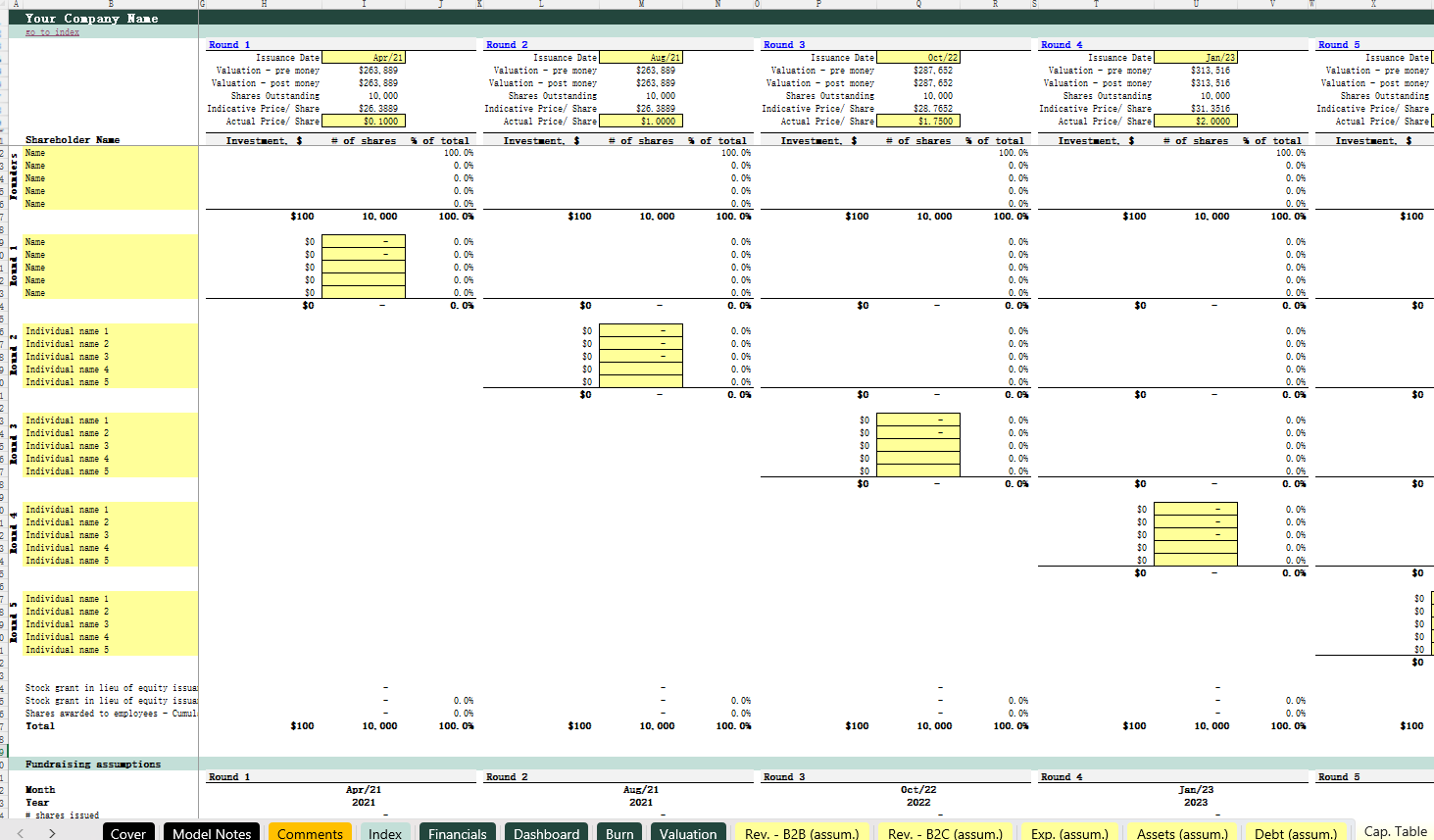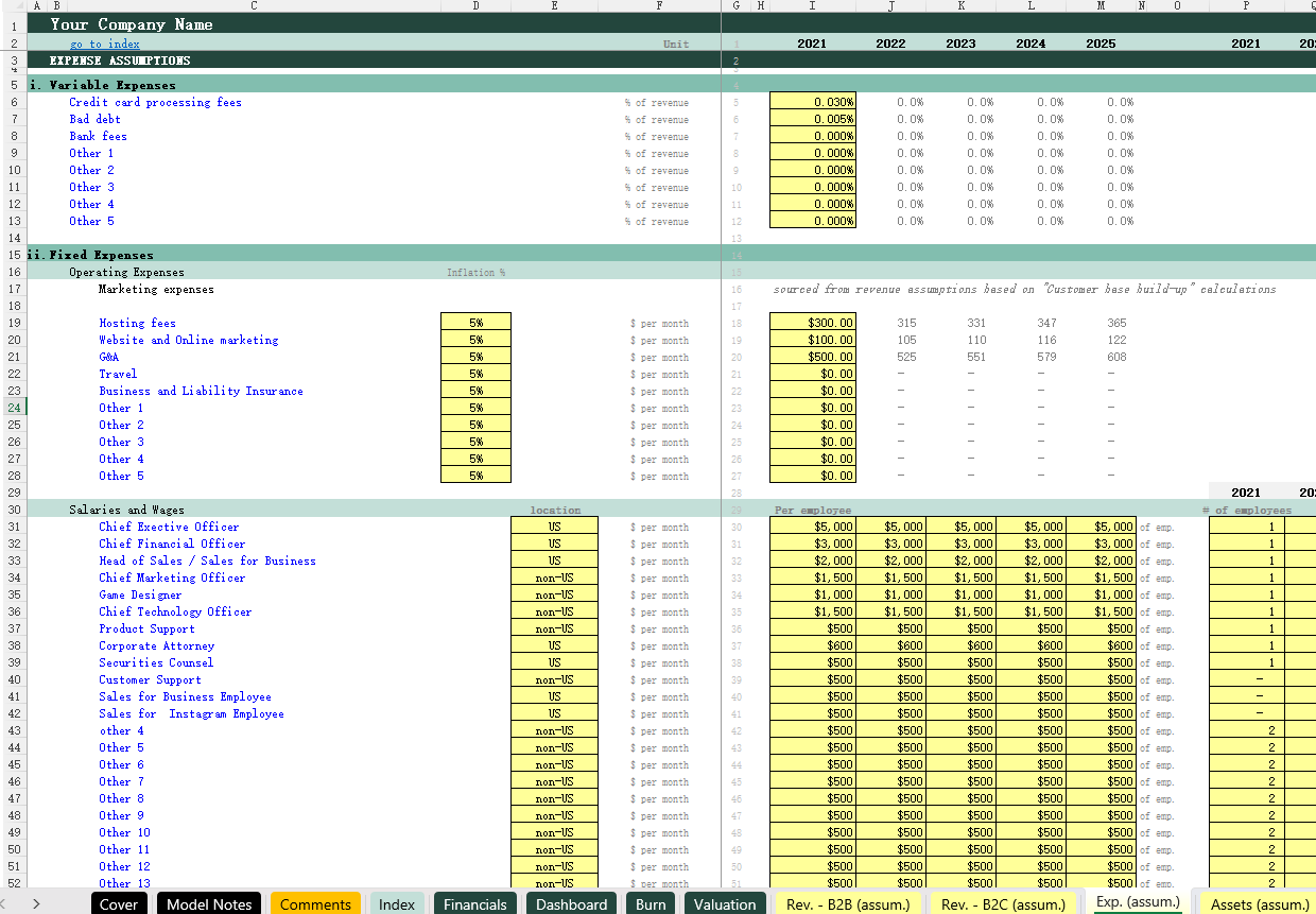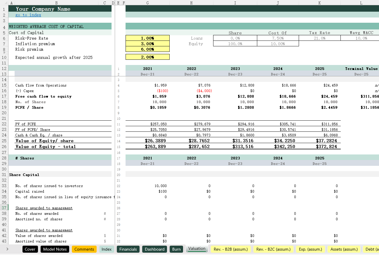 SAAS (B2B+B2C)_Financial model 16小时前 财务模型 · 高级专属 38 **用户购买后,请在页面下方 /左侧下载栏自行下载 Excel模型,以及获取课件观看方式(下载地址2),如有疑问,请添加站长微信。模型介绍此模型适用于任何 SaaS 创业公司,无论是 B2B 业务还是 B2C 业务。模型的关键内容:1)Index – 模型目录,呈现模型的结构(输入,计算以及输出)可以快速定位每一张工作表。2)Financials – 输出三张配平的财务报表,包括月度报表与年度报表。3) Dashboard/Burn – 输出数据可视化图标,包括财务数据汇总,用户数量,现金趋势以及现金消耗率等。4)Valuation – 对项目现金流进行折现估值。5)Rev.(B2B) 与 Rev. (B2C) – 的关键假设条件,包括广告假设,用户数量,分层级的客户分布,获客成本(CPA),客户留存率、每位客户的订阅费用等。6)Exp. (assum.) – 各种费用预测,分成固定费用与变动费用。7) Assets (assum.) – 固定资产预测,包括金额,折旧年限等。8)Debt (assum.) – 债务还款预测,包括本金,利息,借款起始日期等。9)Cap. Table – 股权计算表,记录各种股权资本的变动情况。10)Calc. 1 – 计算表1,展示各种模型的预测计算,包括收入预测,资本预测,固定资产折旧预测,债务预测等。11)Calc. 2 – 计算表2,用于展示资金分布情况。 模型展示 常见问题 (FQ&A) 问:购买之后可以申请退款吗? 答:因为课程属于虚拟物品,所以购买之后不能退换,请仔细阅读课程介绍后,再谨慎购买。问:我已购买会员VIP,是否有会员权益? 答:是,年费VIP会员可享9折购买培训课程;终身VIP会员可用剩余课程答疑时间兑换抵扣培训课时,超出的课时可享9折购买。终身VIP会员购买前请联系站长微信(majojor-advisor)确认兑换的课时。问:我目前是年费VIP,是否可以补差价升级终身VIP,并享受抵扣培训课时的权益? 答:是,年费VIP会员可补差价升级成为终身VIP并兑换抵扣培训课时。 版权声明1、本站所有付费内容都由 Majojor Finance 拥有独家版权和最终解释权。 2、以下均为侵权行为:使用录屏软件以及其他手段录制课程视频;通过技术手段非法下载课程内容;上传课程内容到网盘或者其他平台;通过网络传播课程内容;向其他人分享 Majojor Finance 付费账户并以此非法牟利。Majojor Finance 将永久冻结非法分享的账户,并对以上所有侵权行为进行法律和经济上的追究和诉讼,绝不妥协。 3、只有版权得到保护,才会有更多优秀的作品出现。希望大家尊重我们的劳动成果,尊重版权,一起让我们的版权环境越来越好。 4、若无法遵守以上 Majojor Finance 的版权保护要求,请勿购买我们的课程,凡购买即视为同意以上要求。 资源下载高级会员 免费下载 折后0元下载价格400 元高级会员免费立即购买普通购买下载价格400 元立即购买下载咨询请添加顾问微信:majojor-advisor 原文链接:https://majojor.com/financialmodel/saas-b2bb2c/,转载请注明出处~~~ 0 0